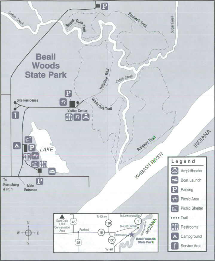 Located on the banks of the Wabash River in southeastern Illinois, Beall Woods State Park attracts visitors from around the world who are interested in experiencing one of the few remaining tracts of virgin timber east of the Mississippi River. At Beall Woods, visitors can see trees 120 feet tall and more than 3 feet in diameter. Besides hiking, Beall Woods also offers visitors a quiet, relaxing setting for camping, picnicking and fishing.