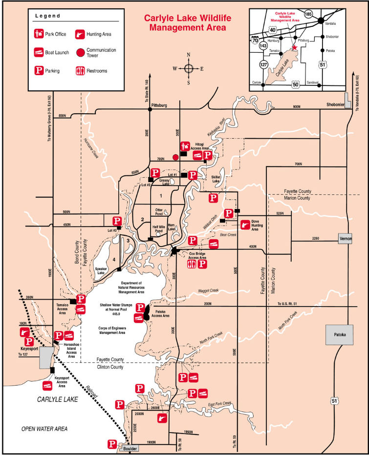 A tremendous variety of outdoor recreational opportunities and natural beauty awaits you at Carlyle Lake State Fish & Wildlife Area, 60 miles east of St. Louis, near Vandalia. The area is at the northern end of Carlyle Lake and at the southwestern tip of Fayette County.