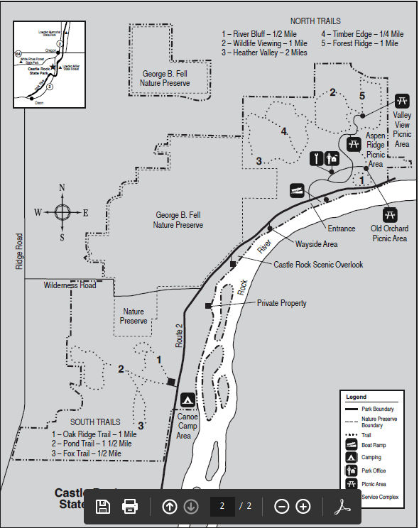 Castle Rock State Park is located along the west bank of the Rock River in Ogle County, three miles south of Oregon, on Ill. Rt. 2. The park is centrally located in the Rock River Hills region of Illinois, and its rolling topography is drained by the Rock River. The park is representative of the Rock River Hills area with rock formations, ravines and unique northern plant associations. A sandstone bluff, adjacent to the river, has given the park its name.