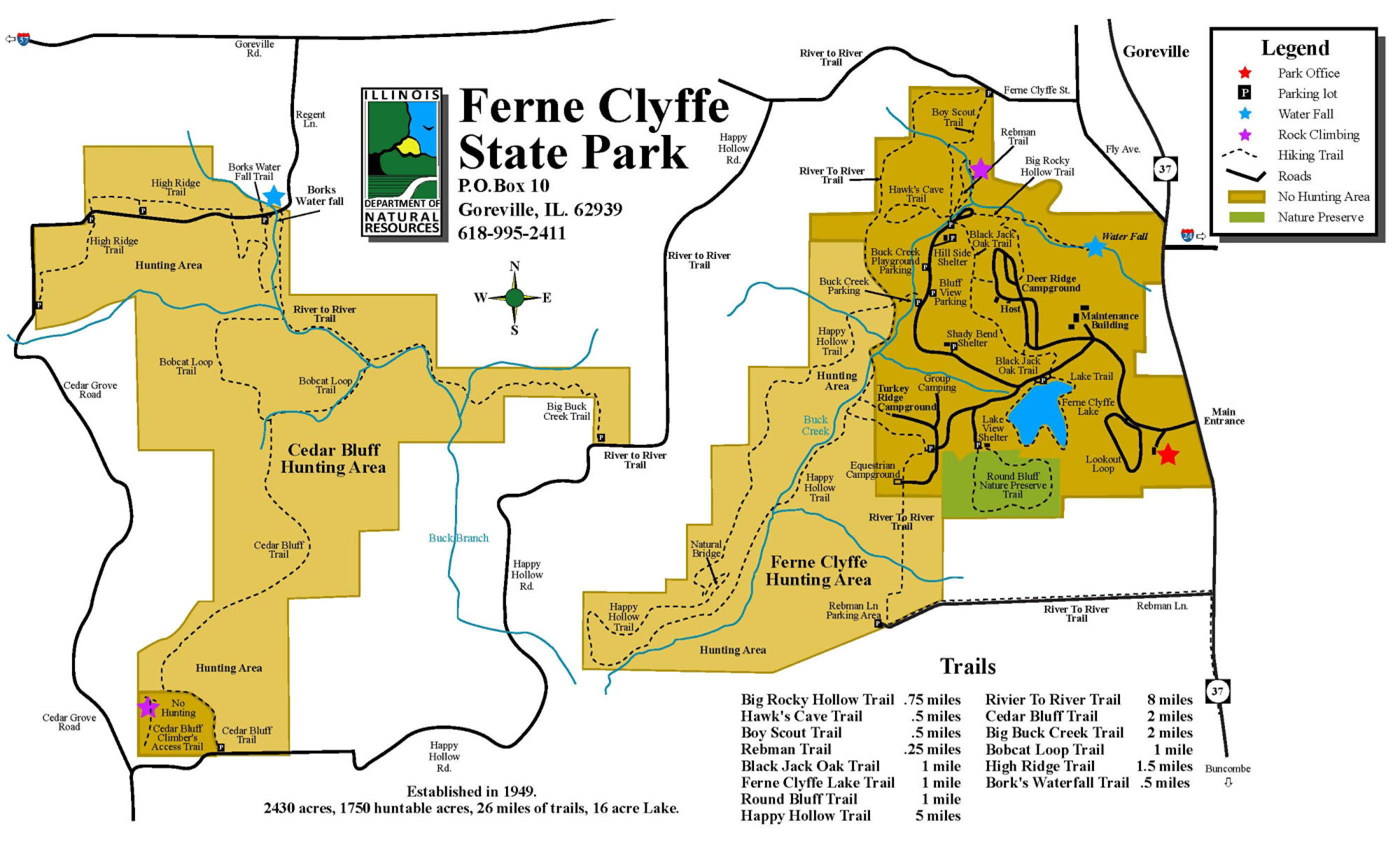 Ferne Clyffe State Park has been known as an outstanding natural scenic spot for a century. An abundance of ferns, unique geological features and unusual plant communities create an atmosphere that enhances the many recreational facilities offered at the park. Trails wind through picturesque woods, allowing visitors to view fascinating rock formations and inspiring vistas. Ferne Clyffe also offers camping, picnicking, hiking, hunting and fishing.