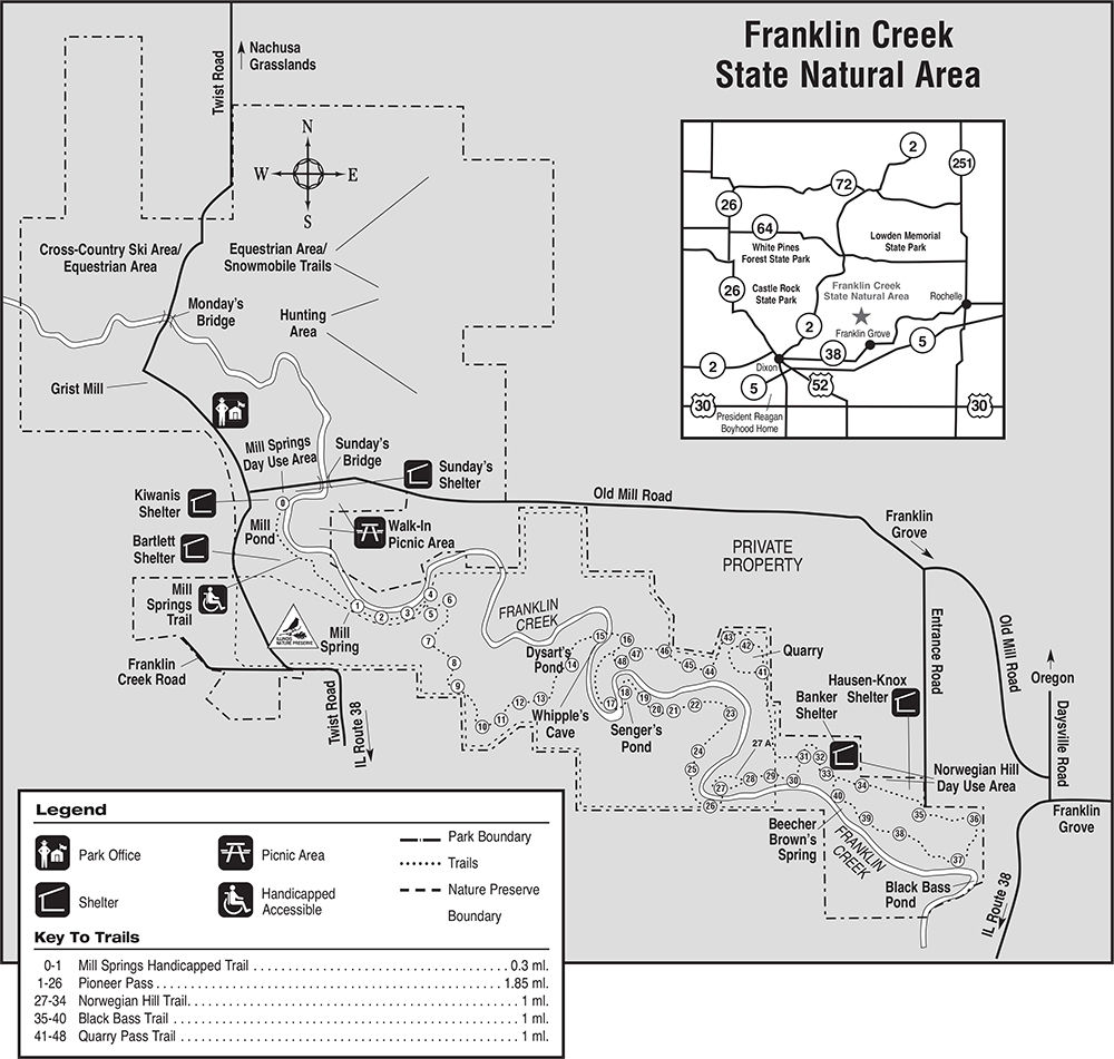 From northerly parts, Franklin Creek State Natural Area is located 10 miles south of Oregon. On IL RTE 64 in Oregon, ½ mile east of the bridge over Rock River is the IL RTE 64/Daysville Road intersection (at the Traffic Light). At this intersection go south on Daysville Road 10 miles to the small town of Franklin Grove. At the northern edge of town, turn right (west) on to Old Mill Road and go one mile to the State Natural Area.