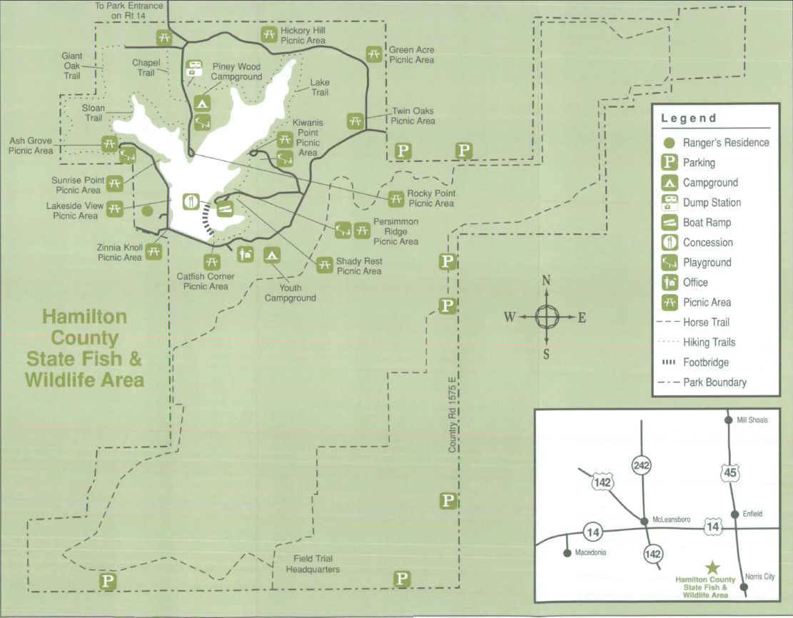 Hamilton County State Fish and Wildlife Area, also known as Dolan Lake, is located about 8 miles southeast of McLeansboro off Route 14.