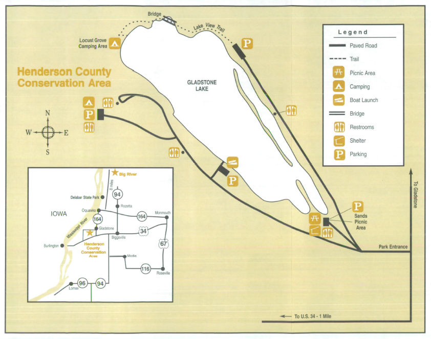 Henderson County Conservation Area, which includes Gladstone Lake, offers a variety of recreational facilities. The 27-acre lake has a shoreline of 1.5 miles and a maximum depth of 25 feet. The area, about 20 miles southwest of Monmouth and five miles east of the Mississippi River, has a total of 87 acres.