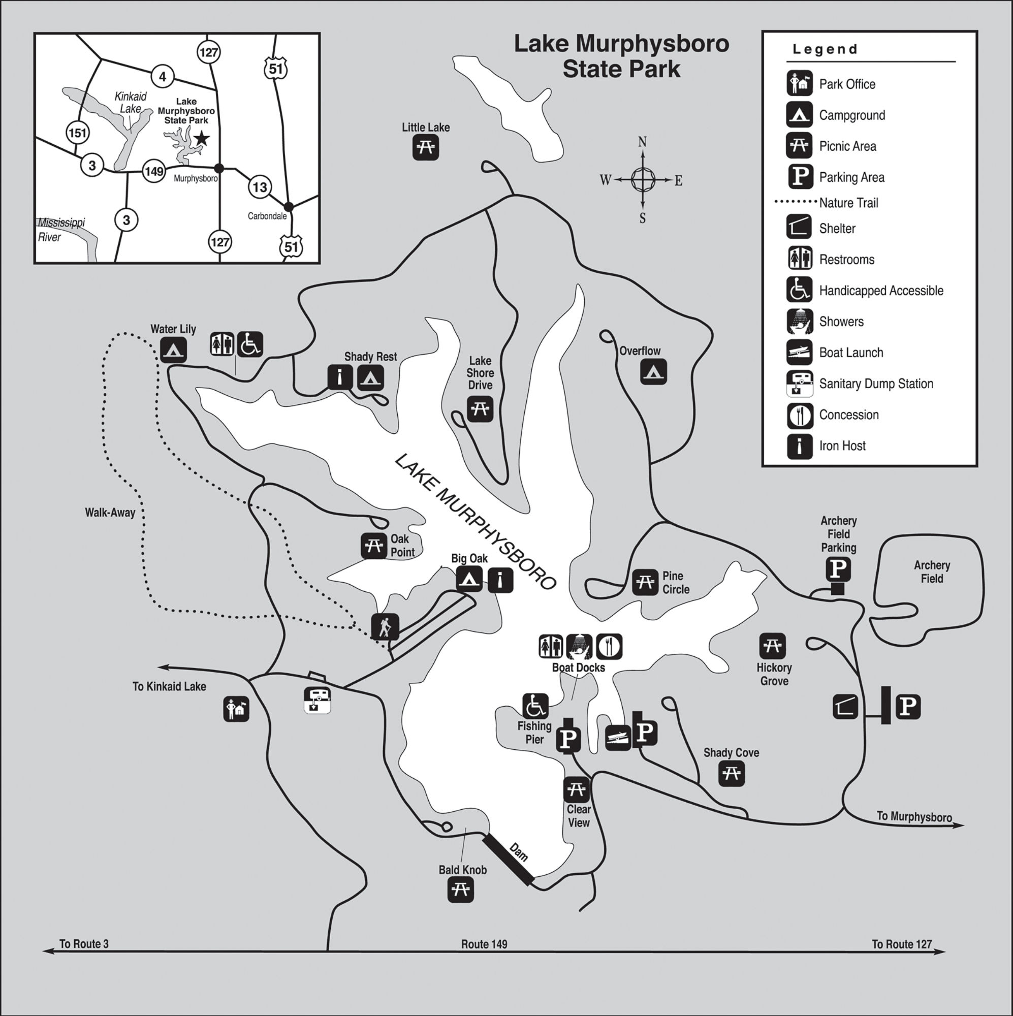 Lake Murphysboro State Park is located in Jackson County on the north side of Rt. 149, approximately 2 miles west of Murphysboro. From Rt. 13, 127, and 149 junction, take Rt. 149 west 2 miles to the entrance of Lake Murphysboro State Park/Kinkaid Lake. From Rt. 3, take 149 east approximately 5 miles to the entrance of Lake Murphysboro State Park/Kinkaid Lake.