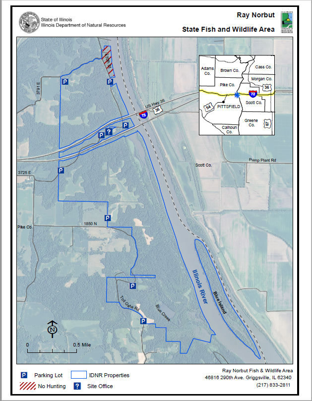 Ray Norbut State Fish and Wildlife Area is a 1,140-acre mosaic of bottomlands, woodlands, wetlands, open fields, steep hills, rocky ravines, hollows, brushy draws and bluffs. Located along the Illinois River, it lies 5 miles east of Griggsville and 2 miles south of Valley City in Pike County. Big Blue Island, a narrow, 100-acre strip of land in the river, is part of the site. Other notable geographic features are two west-east flowing streams--Blue Creek, a river tributary, and the spring-fed Napoleon Hollow Creek.