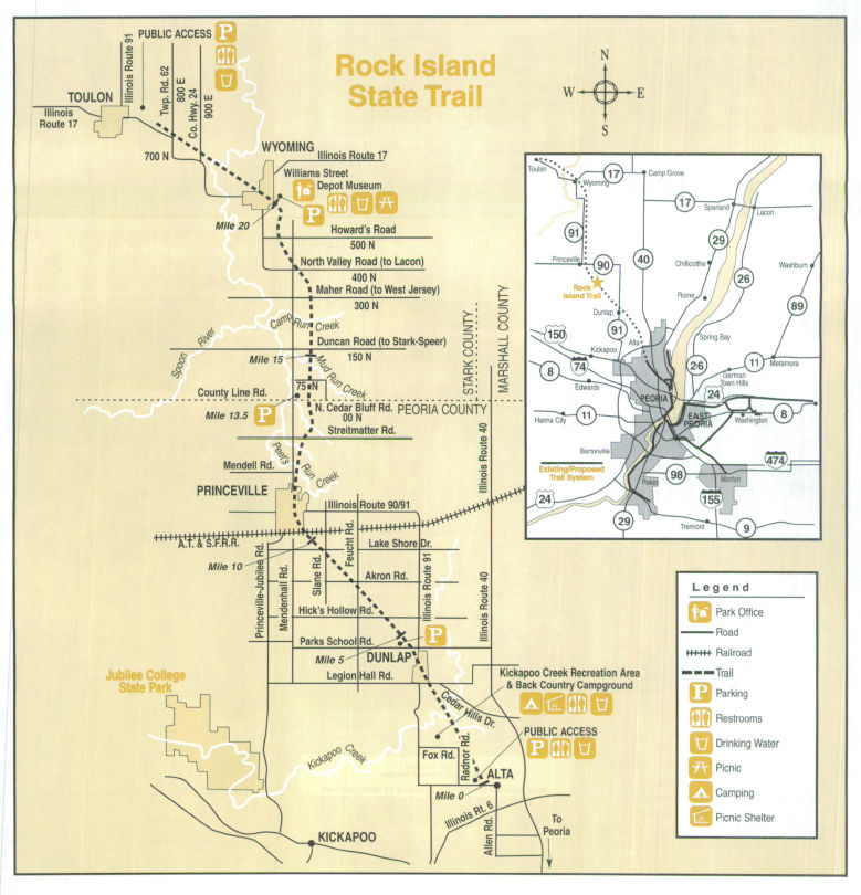 The Rock Island Trail State Park stretches from Alta to Toulon, encountering Dunlap, Princeville and Wyoming along the way. The park office located in Wyoming can be reached from I-80 and I-74.