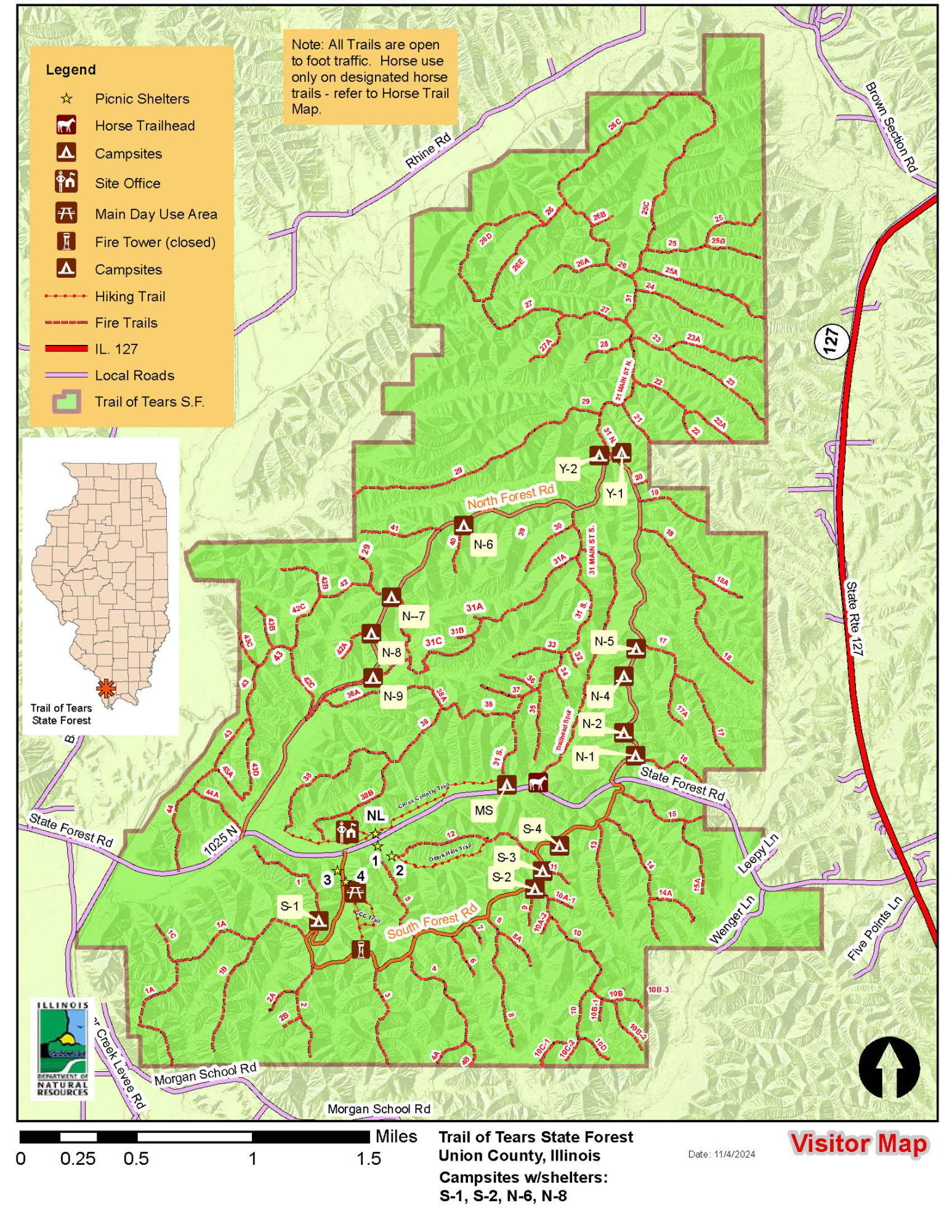Trail of Tears State Forest is situated in western Union County, five miles northwest of Jonesboro and 20 miles south of Murphysboro. Just over 5,000 acres are within the state forest. The state forest system in Illinois was established to set aside lands for the growing of timber needed in production of forest products, for watershed protection, and to provide outdoor recreation. Trail of Tears State Forest is a multiple-use site managed for timber, wildlife, ecosystem preservation, watershed protection and recreation.