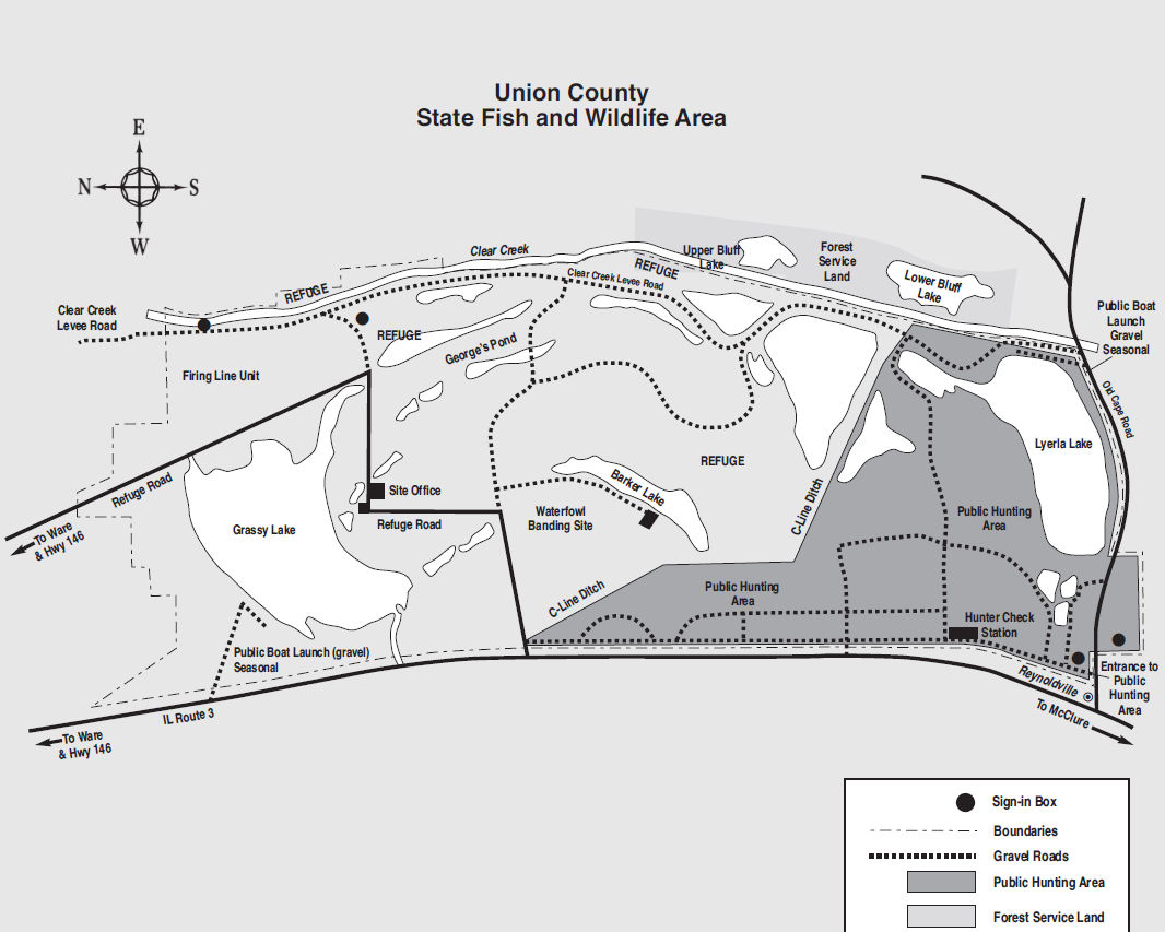 Union County State Fish & Wildlife Area encompasses 6,202 acres in the Lower Mississippi River bottomlands division of Illinois. Numerous shallow sloughs and other water areas totaling approximately 1,100 acres are scattered throughout the area. More prominent water areas include Grassy Lake (350 acres) and Lyerla Lake (275 acres).